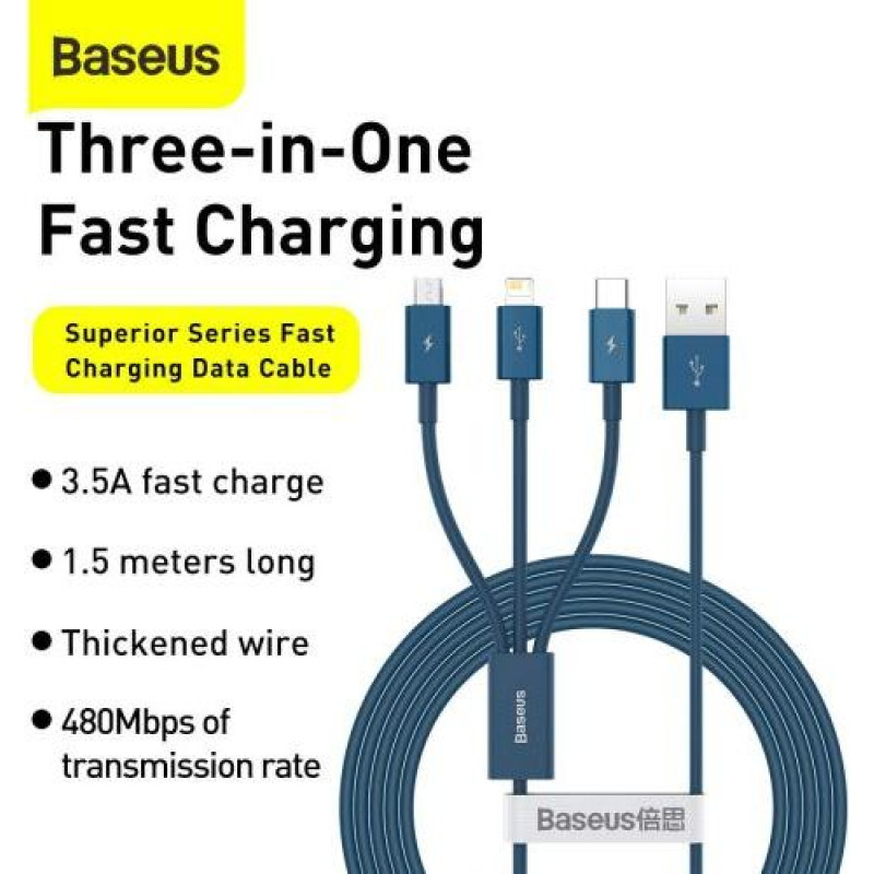 Baseus Cable Superior Series 3-in-1 Fast Charging Data Cable USB to M+L+C 3.5A 1.5m Blue (CAMLTYS-03)